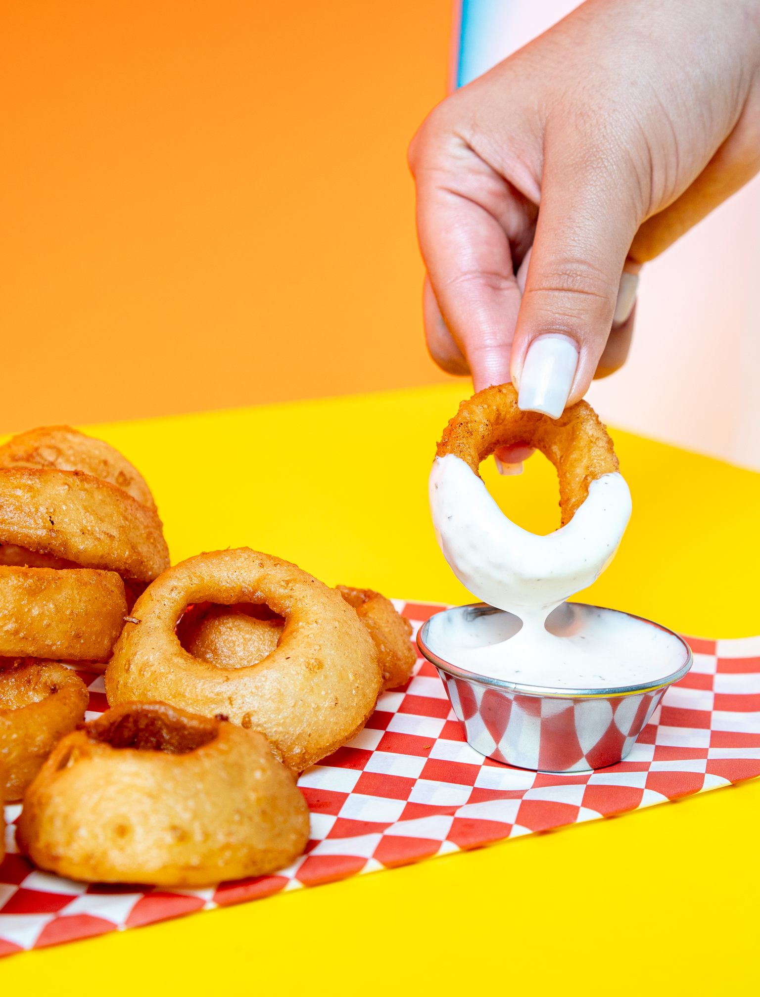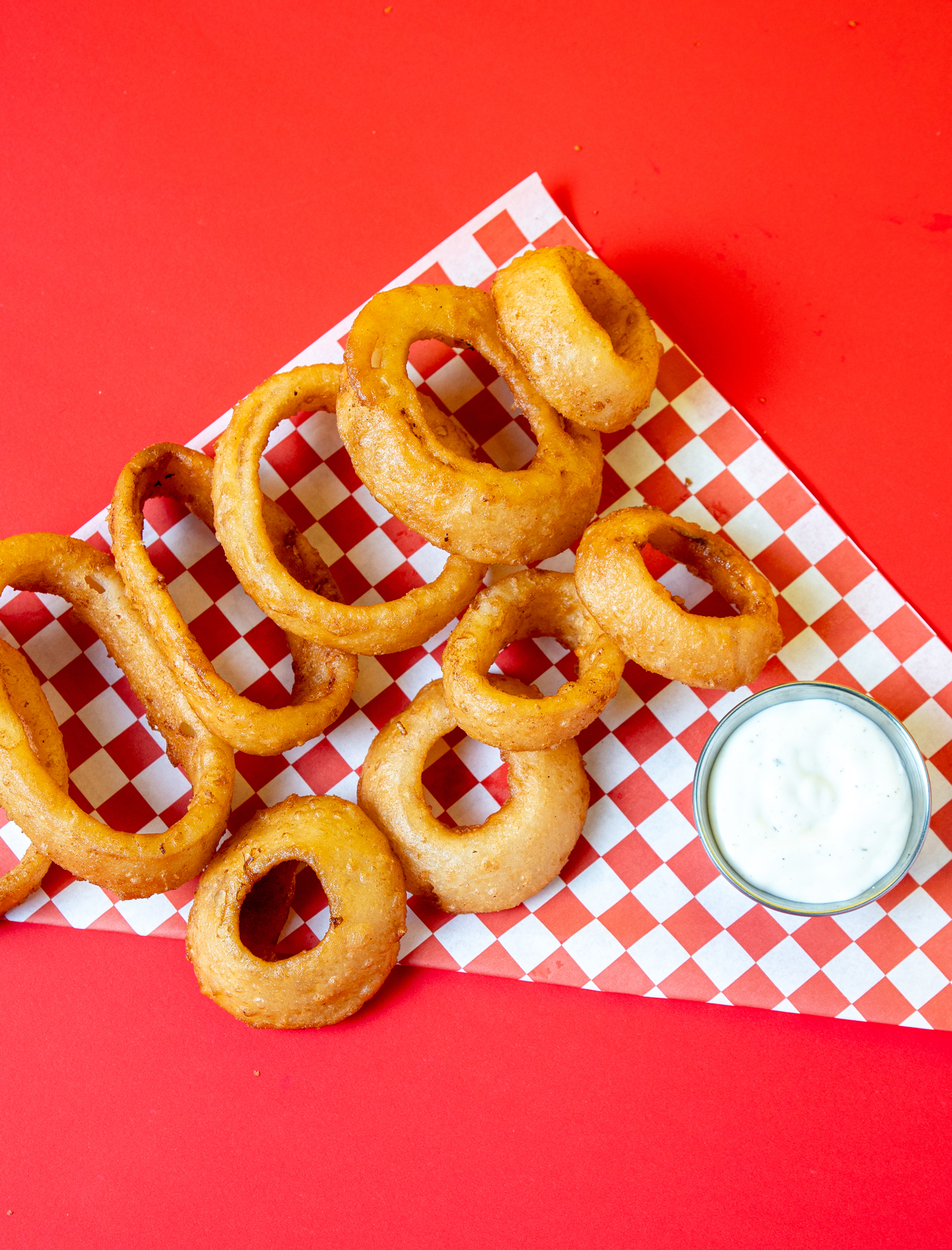 10 aros de cebolla empanizados, salsa de tomate y salsa ranch
