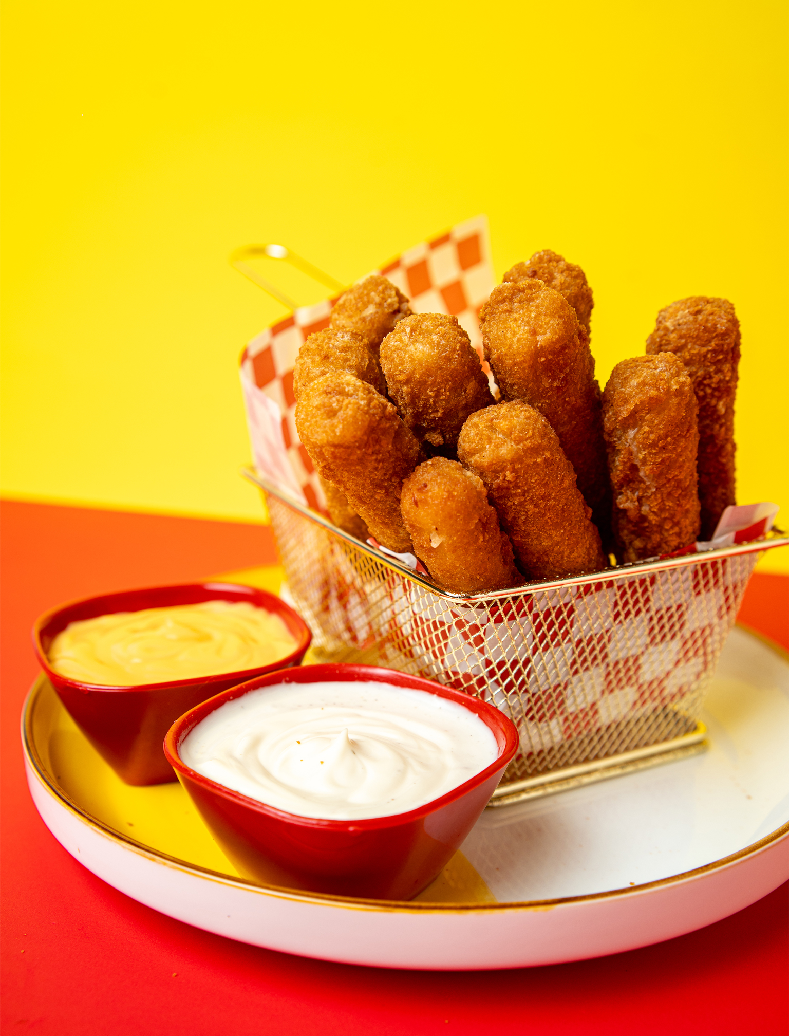 6 mozzarella sticks empanizados, papas fritas a la francesa, salsa de tomate más una salsa a elección.