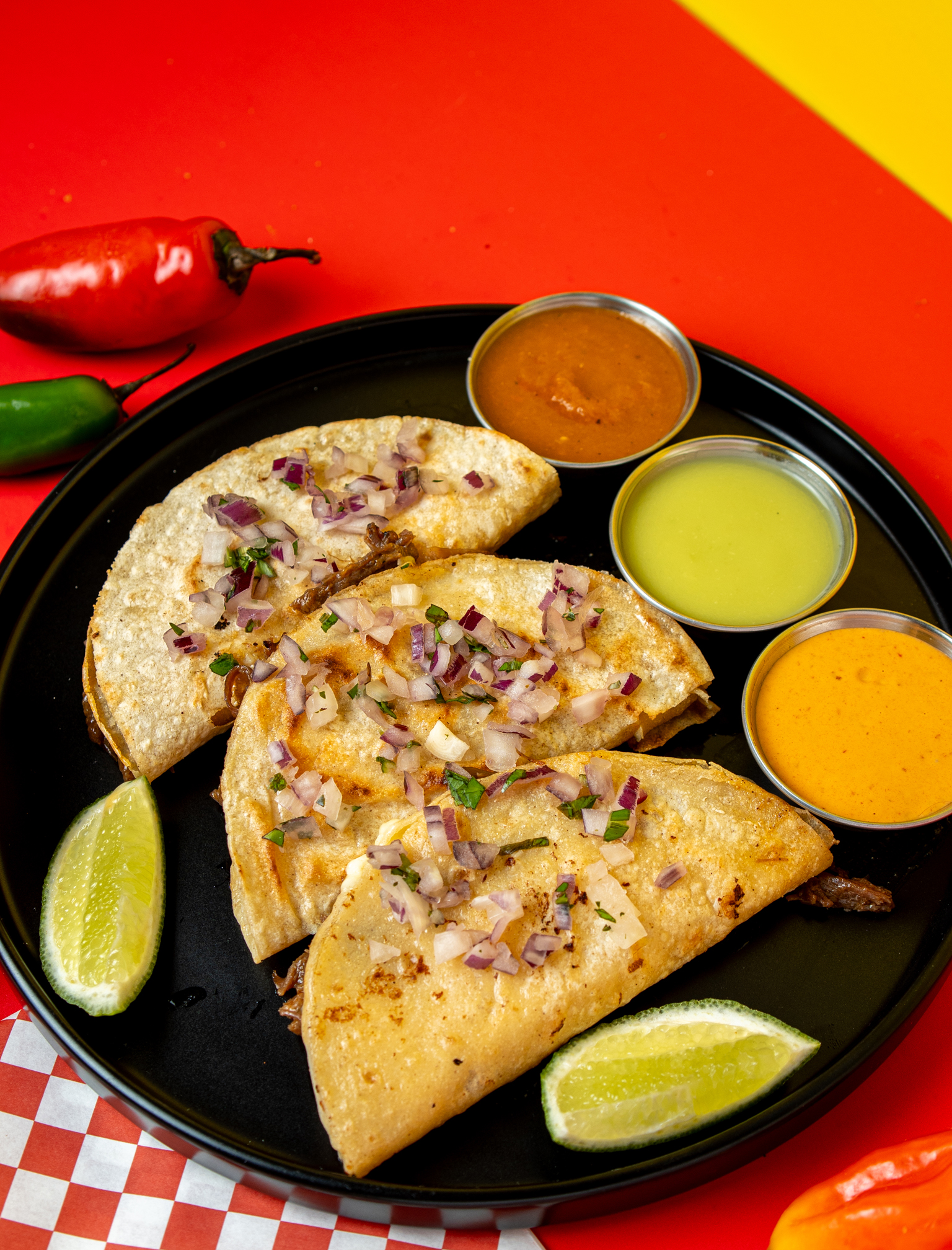 Orden de tres tortillas con queso mozzarella, carne de res, caldo de birria, cebolla con cilantro, chips de tortillas de nachos, salsa roja picante, salsa de guacamole, salsa chipotle y limón.