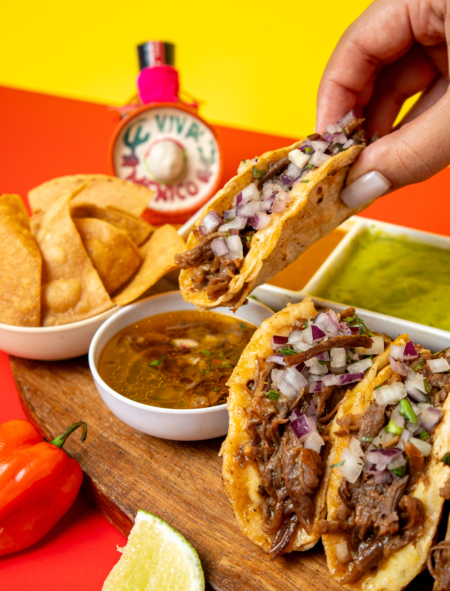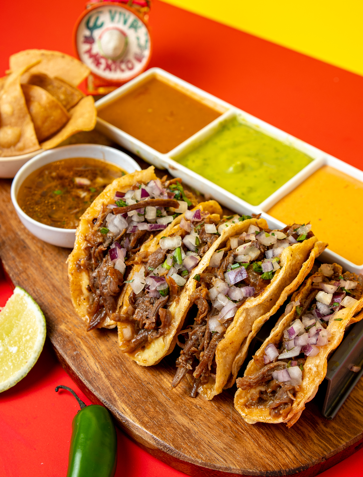 Orden de 4 tacos con doble tortilla, carne de birria, queso mozzarella, cebolla con cilantro, chips de tortillas de nachos, salsa de guacamole, salsa roja picante, salsa chipotle y limón.